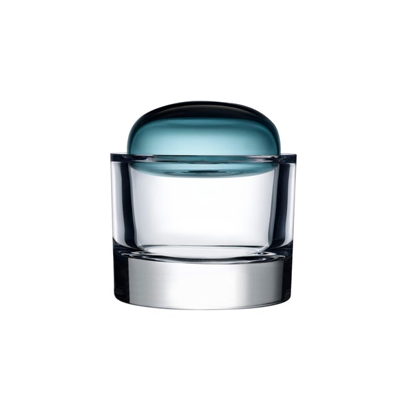 This container offers an elevated sense of sophistication and elegance. Hand-crafted from crystalline glass, this precious piece stands out with its commanding, heavy base, a curved profile and a color-infused lid, which recalls the shape of the Ritten rock formations – an impressive natural monument in South Tyrol.